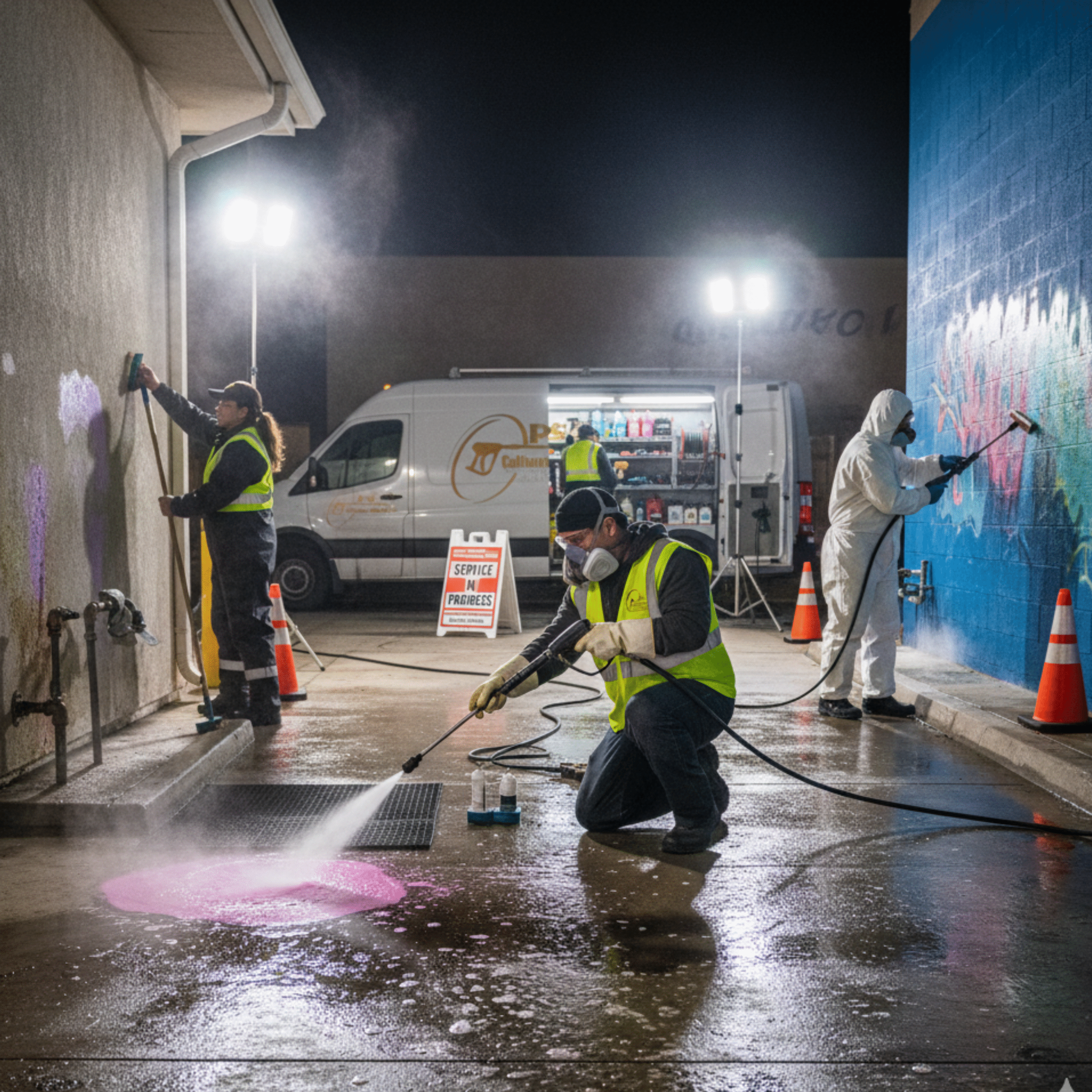Expert Removal of Stubborn Stains and Unwanted Markings from all Surfaces. We effectively eliminate Oil Stains, Grease, Mildew, Mold, Rust, Graffiti, Tire Marks, Gum, and Adhesive Residue. Emergency Graffiti Removal Services available 24/7 to quickly restore your property’s Appearance and discourage repeat Vandalism.
