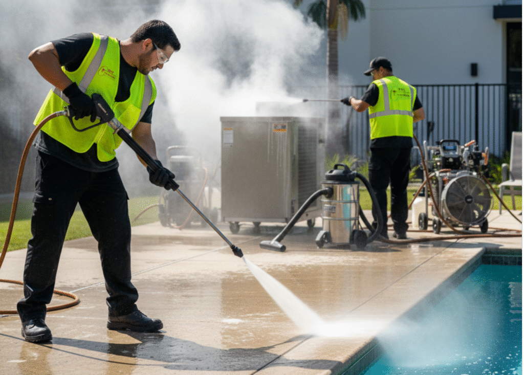 Advanced Cleaning Solutions for Unique Surfaces and Applications. From Pool Decks and Concrete Sealing to Solar Panel Cleaning and Gas Station Maintenance, we have the Expertise and Equipment for specialized Projects. Includes Hot Water and Steam Cleaning for Heavy-Duty Applications and Surface Preparation for Painting or Sealing.